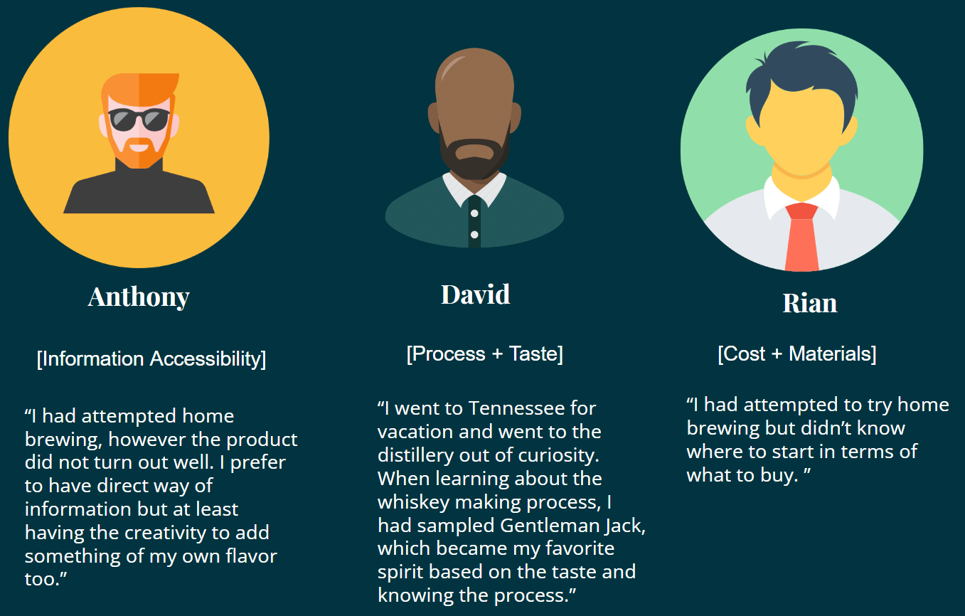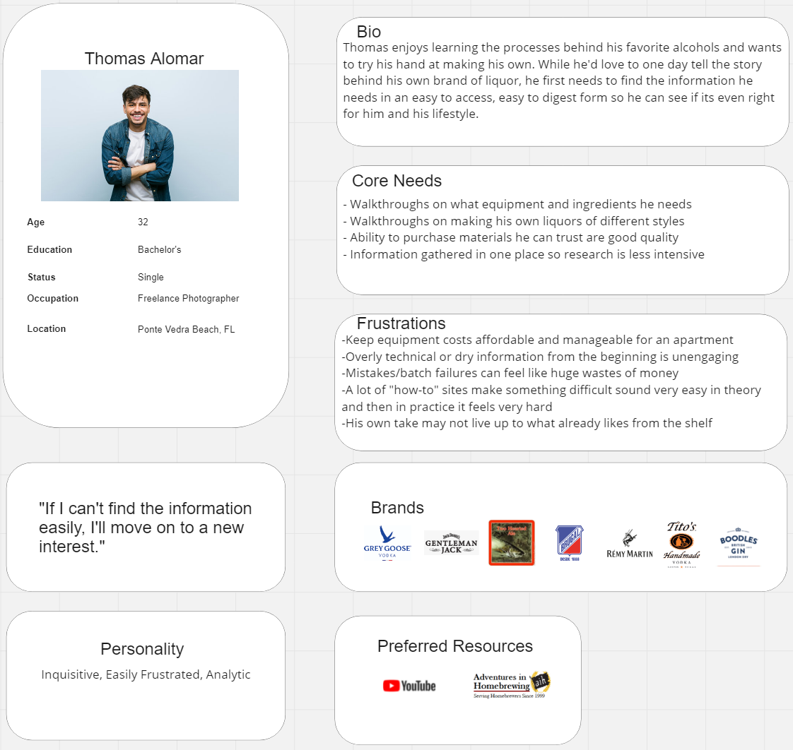 Here, from all the users, we created Thomas. He is in his early 30's, trying to experiment a bit more with his life and wants to try home distilling. He has a variety of different spirits that he enjoys and just wants to create his own style of spirit however from all of our users, we learned that the information found on the internet and in the books are very limited. As you can see from his brands, he wants to make a high quality spirit as some of the ones listed are brand names that are associated with a higher price point usually.