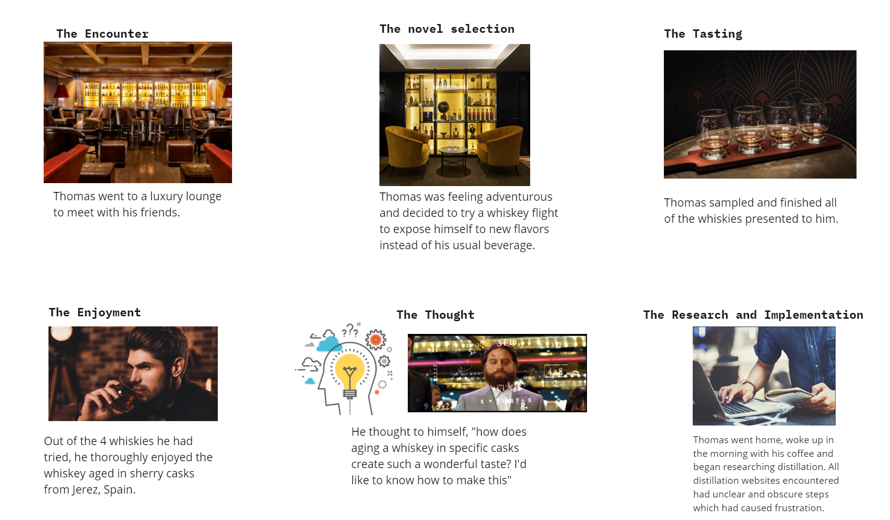 In summary as you do read the scenario above, there are users who go out and try different drinks or they stick to their staple. Sometimes people get curious about what they're consuming, especially how the drink is made. So they do some research or a quick scroll about the company, some say vaguely how their stuff is made, usually saying that they get the finest grains and then they put it in oak barrels, sherry barrels, or other types of wood. The issue is that users want to make those types of drinks, they want to know how they can really make this product similar to what they consume or to try to get into the hobby of it. The problem with that is often times, the information isn't sorted correctly and it just develops to be a bigger mess and confusion for the user instead, deterring them from pursuing the hobby.