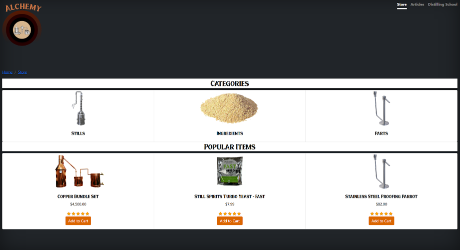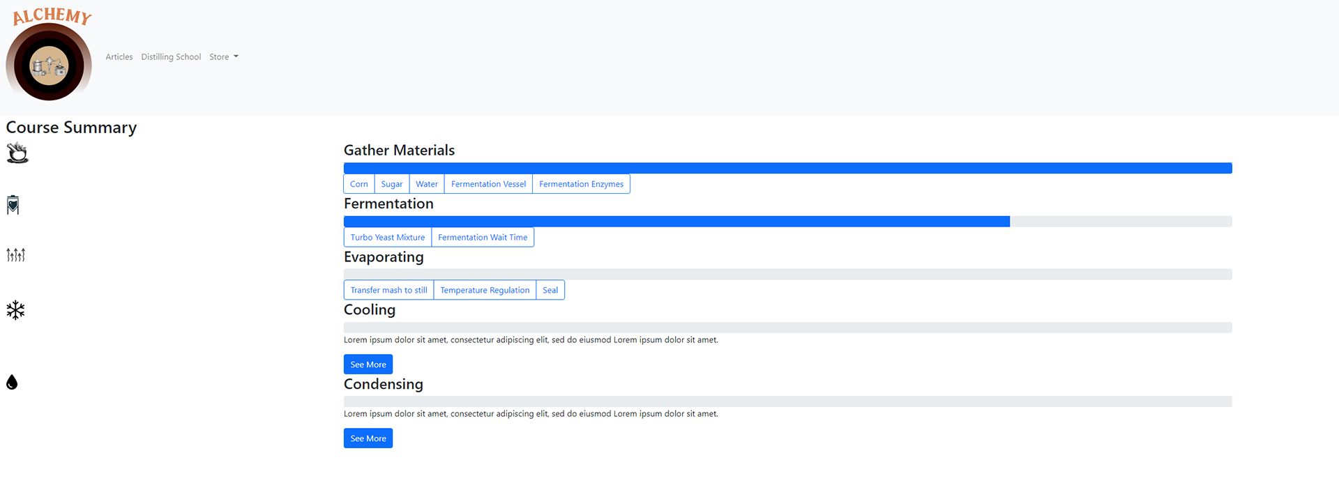 For prototype goals, we created a defined section/tab just for teaching, labelled "Distilling School" while as previously mentioned in the hypothesis, we have a store front too. The store front is available for those already knowledgeable about home distilling but it is also an easy way for our primary user target: newcomers or unexperienced distillers to supplement them with the ingredients we can offer to make their end products. The other tab are articles, these usually are covered by recipes, newsletter items, any additional knowledge or items that supplements the learning from our distilling school tab.