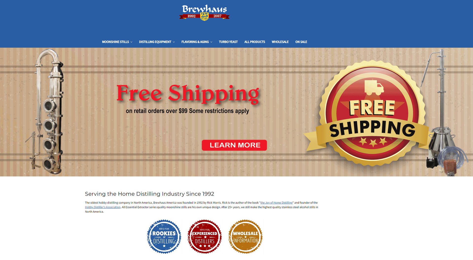 The only one that has a wonderful UI is their navigation and their homepage would be hillbillystills.com. It has a simple and fluid hover navigation that is relatively organized in the matter that you can get what you are searching for, which all of these websites sell: stills and the ingredients to make the final product. hillbilly stills have an interesting addition as they have a distilling calculator page, letting you just put in the measurements of your set-up and the amount of ingredients you put into the process and it'll give you the answer at the end.