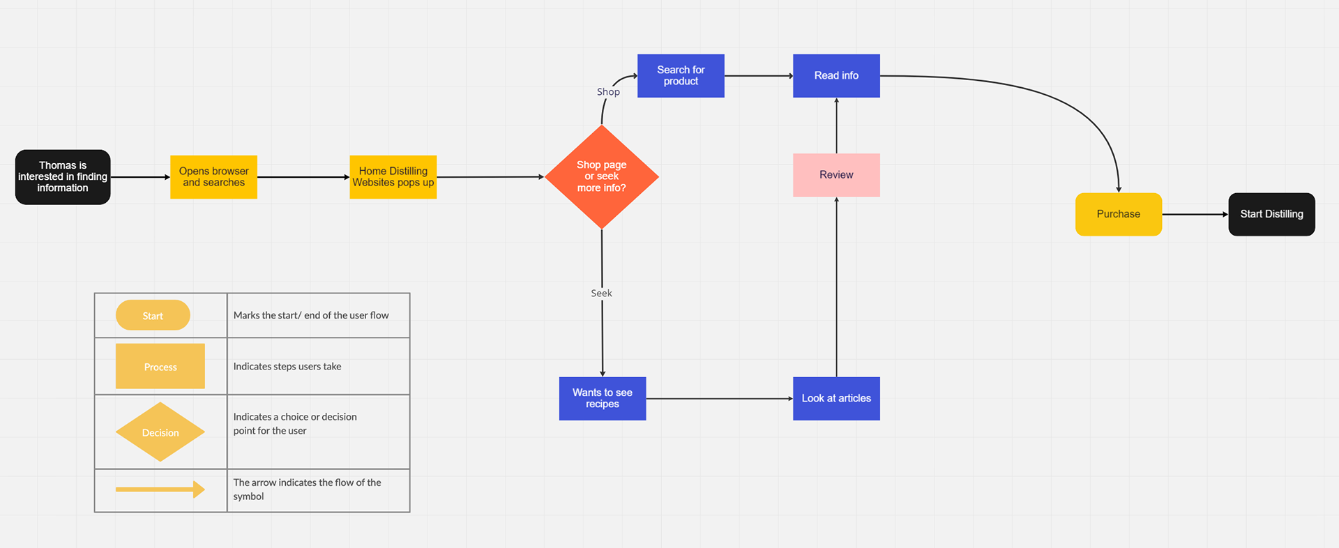 We designed a user flow with problems like Thomas’s in mind. Our design attempts to provide beginner-friendly information like recipes and articles on styles of liquor as well as provide a store front.